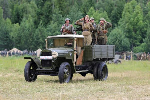 Участвуют 1-5 человек, участвующих в автопробеге, переодетых в духе военного времени.