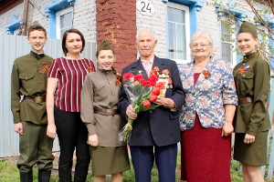 К Евгению Тимофеевичу Адонину с поздравлениями пришли и учащиеся Константиновской школы. Одетые в форму военных лет, ребята преподнесли ветерану цветы, поздравительный адрес и пригласили его на встречу в честь праздника в родную школу.