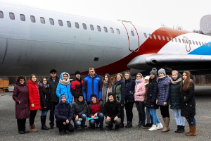 Во второй части экскурсии ребята почувствовали себя в роли пассажиров бизнес-класса реактивного пассажирского самолёта «Ту-154». В салоне самолёта состоялась беседа с генеральным директором А.В.Гусевым. Он — человек, влюблённый в своё дело, знает, ценит и любит вверенное ему предприятие. Алексей Викторович провёл небольшую викторину, победителем которой стал Ярослав Козеев.