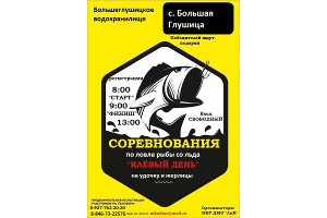 03 марта 2019 года на территории Большеглушицкого района снова пройдут соревнования по рыбной ловле со льда, что стало приятной традицией. Состязания будут организованы по 2 номинациям: ловля со льда на зимнюю удочку и ловля на жерлицы, в каждой из которых будут определены победители.
