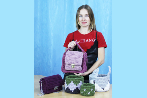 Первая трикотажная пряжа была экспериментальная — начинала работу, затем распускала ее по нескольку раз для того, чтобы понять новый материал и приспособиться к нему. Нюансов здесь очень много: нужно учитывать плотность изделия в зависимости от того, каково будет его предназначение. Сначала это были разнообразные корзины для игрушек, белья, косметики. А со временем появлялось все больше интереса и хотелось создавать что-то новое. Затем стала вязать коврики большие и детские, представляющие собой лицо медвежонка, потом всевозможные сумочки, ожерелье, игрушки, свитера, шапки, снуды, пуфы, подушки и даже домашние тапочки. Одним словом, при желании можно сделать все, что угодно, достаточно лишь добавить соответствующую фурнитуру. Сейчас у Ксении дома много полезных предметов для быта и интерьера, изготовленных вручную из стопроцентного гипоаллергенного хлопка, который не колется, не деформируется и удобен в использовании. В планах на будущее — навязать кучу красивой и практичной одежды для себя и для дочки. Ведь любое изделие выглядит оригинально, потому что в него вложена душа мастерицы и ее позитивная энергия.