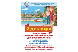 Управление федеральной налоговой службы по Самарской области информирует, что 2 декабря — срок уплаты имущественных налогов для физических лиц: земельный налог, налог на имущество, транспортный налог.