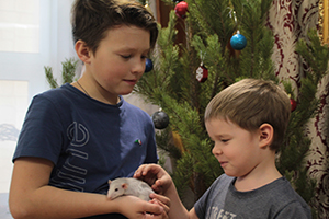 Еще в семье есть большой аквариум с разными рыбками — гупешками, барбусами, сомами. При каждой чистке аквариума Пушок старается их выловить из емкости с водой, пока не видят люди. А вот хомяк Хомка в обиду себя не даст. Он предпочитает спокойно проводить время в своем домике, а когда дети пытаются взять его в руки, начинает кусаться и агрессивно себя вести. Зато недавно приобретенная крыса Бублик, напротив, очень тихая и дружелюбная. Если раньше появлению нового животного способствовали дети, то на этот раз в преддверии наступающего года крысы инициатором была мама. В детстве у Марины была крыса, поэтому она уже знакома с ее характерными особенностями. Совершенно безобидный, дымчатого окраса зверек может просидеть на плече или на груди у человека сколько угодно. Охотно идет на руки и никогда не кусается. Удивительно, что и кот Пушок относится к ней совершенно безразлично. Неприхотливый в еде и уходе Бублик не требует к себе особого внимания. Чтобы он был сыт, достаточно столовой ложки зерна в день. Иногда дети подкармливают его кусочками фруктов или овощей.