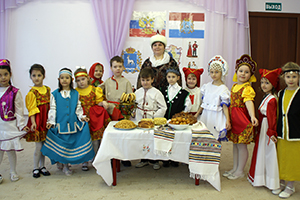 Ребята старшей и средней групп подготовили стихи о различных народностях, презентовали блюда кухни. Подвижные национальные игры «Заря-заряница», «Тюбетейка» и «Медведь» особенно понравились малышам.