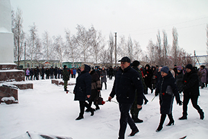 Церемония возложения цветов проходила под трогательную музыку. Красные гвоздики были возложены к Монументу славы с именами наших павших земляков в годы Великой Отечественной войны. На белом снегу они смотрелись, как капли алой крови.