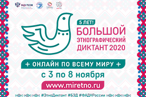 В 2020 году Международная просветительская акция «Большой этнографический диктант» состоится в пятый раз. Диктант проводится в единый период – с 3 по 8 ноября 2020 года. Формат проведения — онлайн.