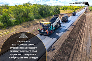 На участке км 7+000 км 23+000 строители завершают укладку верхнего слоя дорожного покрытия и обустраивают съезды.