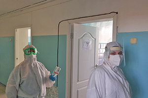 27 сентября этого года отделение возобновило свою работу. Врачи, медицинские сестры, технический персонал нашей больницы — 26 человек — переведены в это отделение для оказания медицинской помощи пациентам с диагнозом СОУГО-19. По доброй воле они ежедневно рискуют собой и своим здоровьем, выполняя врачебный долг и помогая больным людям. Заходя на смену, одевая защитное обмундирование — костюм, очки, бахилы, респираторы, медицинские шапочки — где гарантия, что завтра они сами не окажутся на больничной койке? В медицинской среде сейчас актуальна фраза, что в борьбе с коронавирусом, как на войне. А прививка — как бронежилет. Весь коллектив ковидного госпиталя прошел вакцинацию — это обязательное условие.
