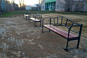 Уже произведена установка бордюров, в основание засыпан песок, укладывается тротуарная плитка, установлена информационная доска, забетонированы основы для тренажеров, три лавочки для отдыха заняли свое место.