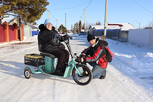По морозу с ветерком мчится Вера Павловна Мартынова по улицам села Большая Глушица на своем веломобиле. Ни мороз, ни дождь, ни ветер не страшны ей на этом самодельном транспорте, который изготовил для нее сын Александр.
