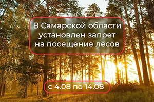 На территории Самарской области, в связи с высокой пожарной опасностью в лесах, с 4 по 14 августа включительно установлен запрет на пребывание граждан в лесах и въезд в них транспортных средств на территории всех лесничеств Самарской области.