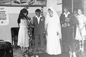 В нашем случае с 1975 — 1990 годы браки заключались в Домах культуры. Женихов и невест встречали торжественно, а сама регистрация была волнительным и памятным событием. Например, Ирина Владимировна, как работник Дома культуры, обязательно вместе с другими сотрудниками украшала зал: рисовали огромные плакаты, расстилали красный ковер, ведь во все времена он символизирует богатство и благополучие. По краю дорожки ставили огромные живые цветы — белые каллы. Само же торжество проходило в фойе клуба, где собиралось большое количество гостей и односельчан. Они заполняли весь зал, а кому не хватало места, терпеливо ждали на улице, заглядывая в широкие окна.