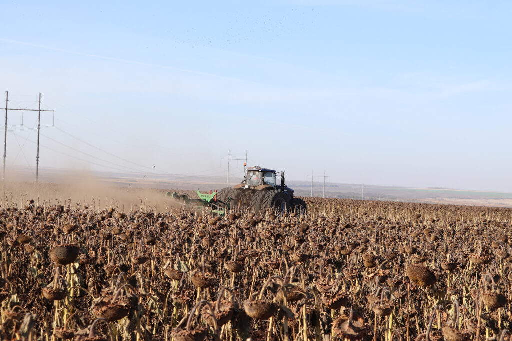 На следующем поле после уборки нута завершается вспашка зяби чизельными плугами с внесением твердых минеральных удобрений (диамофоска) — это уже отработанная технология. На одном из тракторов Buhler трудится механизатор Василий Иванович Нечаев, его стаж в этом хозяйстве — более двадцати лет. За смену каждый тракторист обрабатывает 26-30 га пашни. Небольшая остановка, Николай Алексеевич разговаривает с ним о том, как идут работы. И двигаемся дальше.