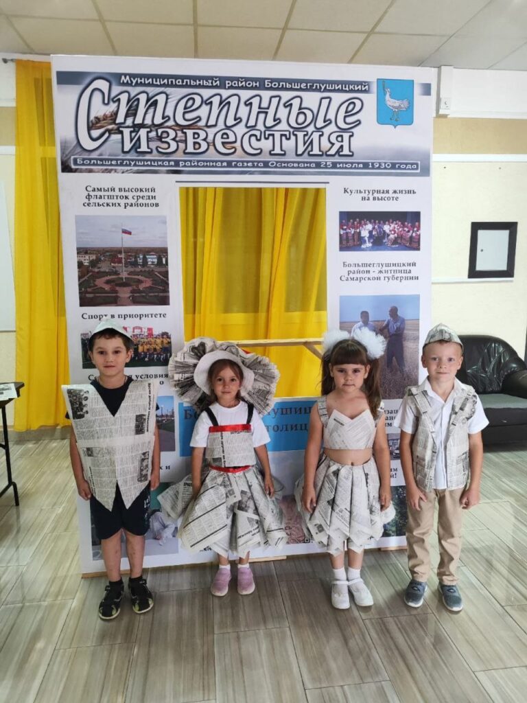 Первым делом позвонили руководителю детского сада Г.А. Юдиной. Когда ей предложили с воспитанниками принять участие в концерте, где нужно было прочитать стихи о газете, то еще в процессе разговора у нее зародилась интересная идея. «А что если дети выступят не просто в черно-белой форме, а предложить родителям дополнить образ коллекцией нарядов из газет?» — рассказывает Галина Александровна.