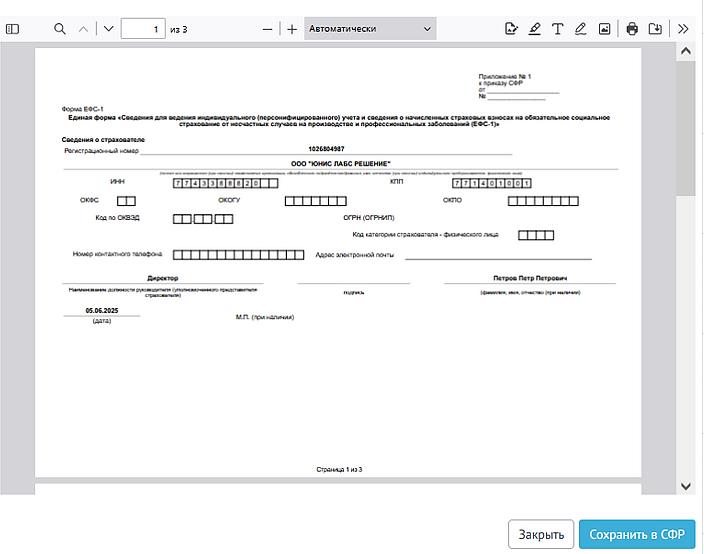 При успешном прохождении кнопки «Сформировать» пользователю доступен предпросмотр отчета (Рисунок ). После завершения предпросмотра необходимо нажать кнопку «Сохранить в СФР» (Рисунок ).