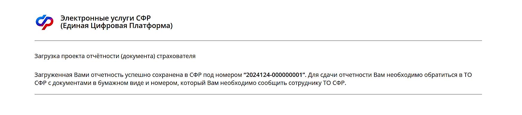 После загрузки отчета пользователю выводится информационное сообщение о ее успешности и номер, под которым данная отчетность сохранена в СФР.